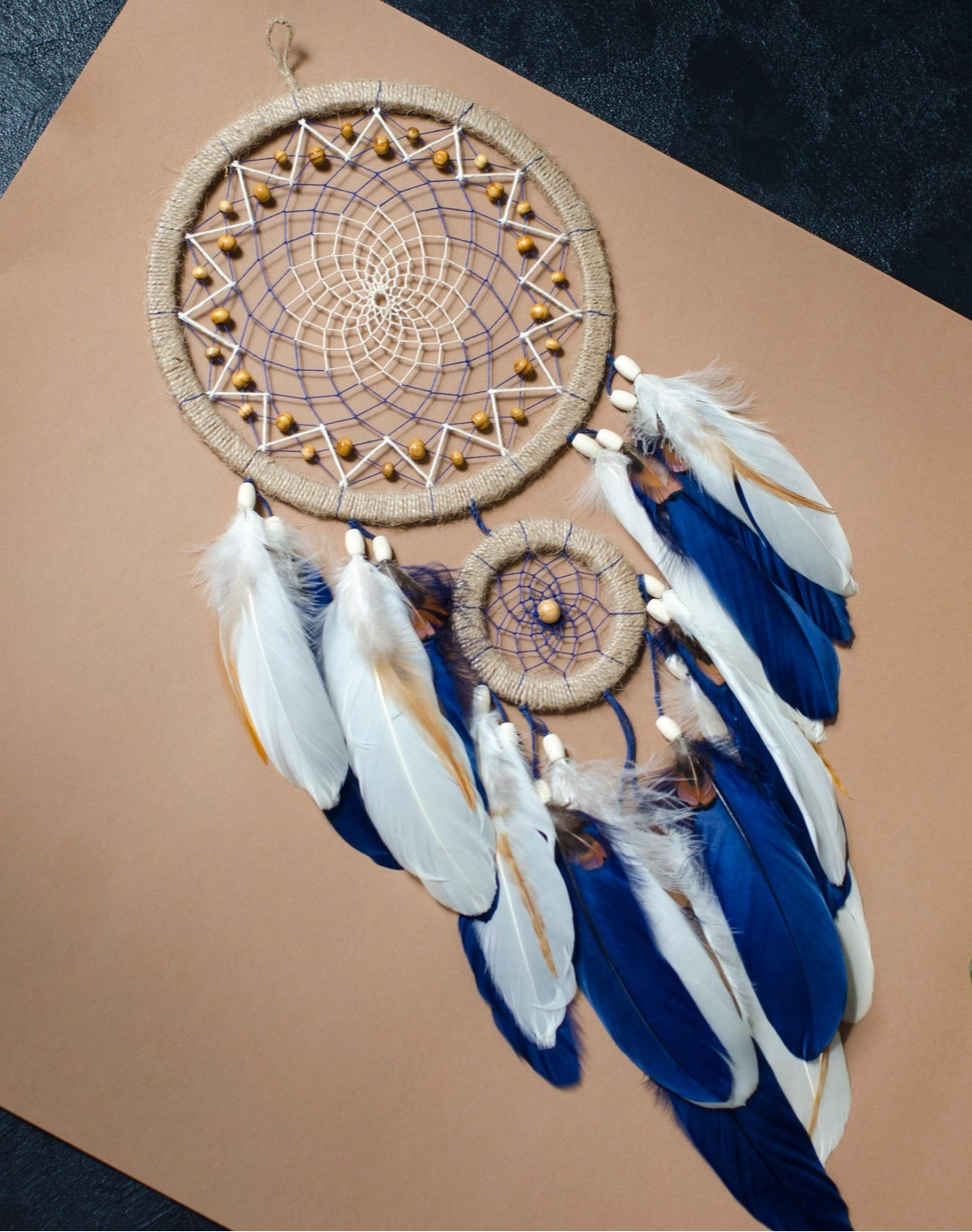 The first variation of the dreamcatcher has a single beige hoop with a dark net, adorned with wooden beads and feathers in blue and white.